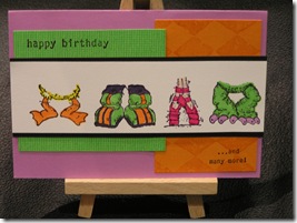I've done this card, or at least one very similar, for $2 cards last year, but I gave away the original to my nephew for his birthday, and have been meaning to do another one. The original was made by DC3kids, on www.splitcoaststampers.com