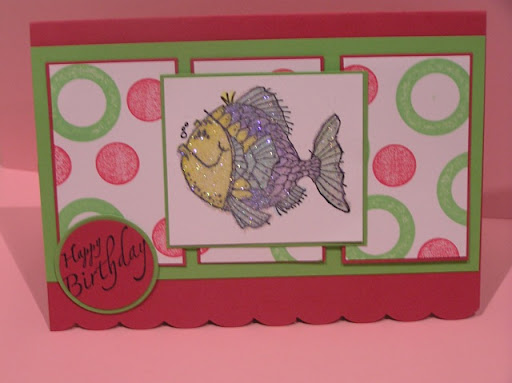 Recipe : Stamp Sets : Fishy Friends, Riveting (Hostess set), It's Your Birthday.  Cardstock : Rose Red, Green Galore, Whisper White.  Inks : Rose Red, Green Galore, Basic Black, Versamark, Staz On Black.  Accessories : 1 3/8" & 1 1/4" circle punches, corner rounder (for scalloping), Heat & Stick Powder, Dazzling Diamonds, Heat Gun