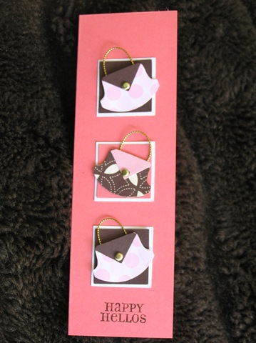 Hello! Today I made a card just for fun - no reason at all, which was just lovely! It's inspired by a card that I looked at this morning by http://stampinat6213.blogspot.com/. A very talented lady & fantastic blog. This card is made with the round tab punch for the base of the handbag, and the 1 1/4" square punch for the flap. I used gold brads for the clasps, and some gold cord for the strap. I'm quite pleased with this card, so I'm going to be making them for $2 cards which is on this Wednesday from 6-10pm. Drop in anytime, make as many or few of the five different cards I pre-cut, and have a laugh with other women (men are more than welcome too!!). It would be helpful if you could let me know if you are intending to drop in, so I can make sure we have enough chocolate! Love to see you then.