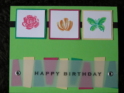 Recipe : Water Colour Minis, It's Your Birthday. Inks : Black Stazon, Rose Red, Regal Rose, Green Galore, Garden Green, So Saffron, Pumpkin Pie . Cardstock : Green Galore, Rose Red, So Saffron, Garden Green, Basic Black, Whisper White, Vellum.