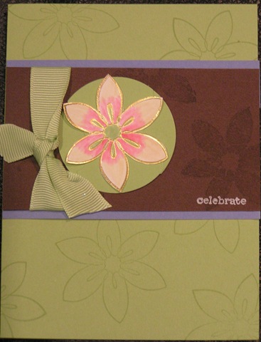 Good morning! What a great weekend I had with lots of women over for Technique Class on Saturday and Sunday. They worked their butts off, getting 10 different cards made with 10 techniques. Well done to you all - hope you weren't too exhausted at the end. I'm still buzzing over it! I'd like to thank Cherie, who bought the most wonderful cake over, even though she had just moved house this weekend! To Helen & Kim, who stayed on to help sort out some of the mess at the end of class, Thanks also! I'd also like to thank my Mum, without whom I wouldn't be where I am today... LOL (Does this sound a little like the Oscars?...) Anyway, I thought I would give you a little look at one or two of the cards we made.