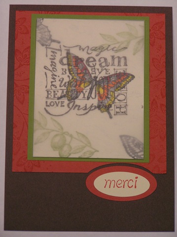 The first one is Faux Tiling, which Trish Griffin demonstrated at our Stampin' Up! Training in New Plymouth at the start of this month. Thanks for that Trish! Really was pleased with this card - LOVE Stem Silhouettes (last day TODAY to purchase this set - EVER). Recipe : Stamp Sets : Paisley Background, Stem Silhouettes. Cardstock : Always Artichoke, Elegant Eggplant, Very Vanilla. Inks : Elegant Eggplant, Always Artichoke. Accessories : Very Vailla Ribbon, Scorer, Clear EP.